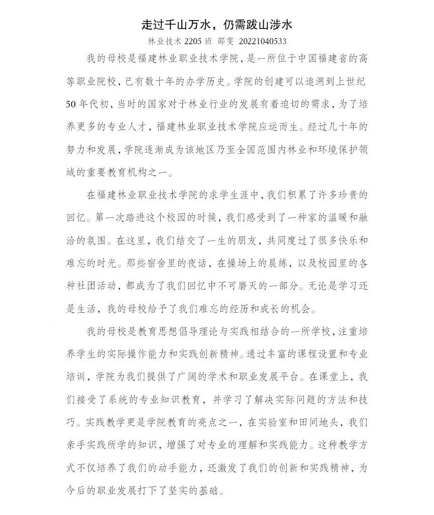征文活动的主题将紧密围绕“我们的母校、我们的回忆、我们的未来”,鼓励参与者表达对学校七十年发展历程的独特见解、对学校精神的理解、对未来发展的展望,或是回顾自己的成长与学习经历。在培养写作能力和凝聚全校师生的热情的,共同庆祝这一特殊时刻。以下是本次比赛的获奖作品。