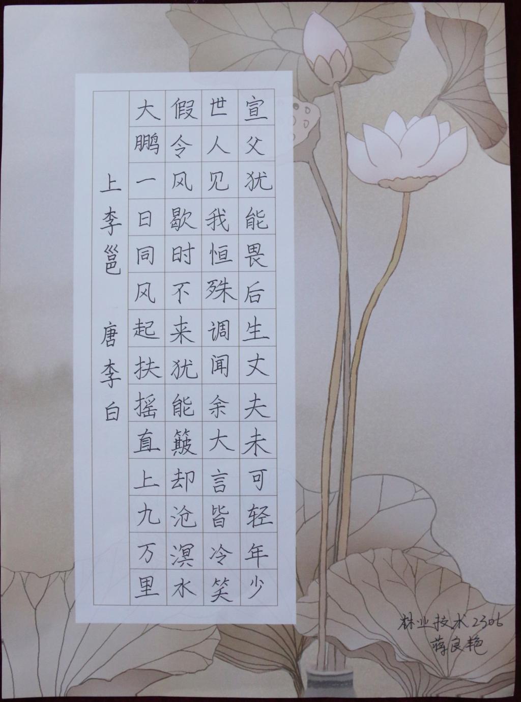 古墨轻磨满几香,砚池新浴灿生光。书法艺术是中华文化博大精深的一环,硬笔书法更是融入日常生活,成为我们表达自己不可或缺的一部分,以笔传情、执笔传声。12月4日至10日,林学系两委会举办“翰墨书香”硬笔书法比赛。