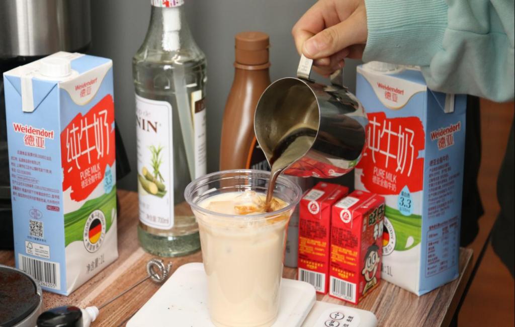 首先将牛奶加入杯子的八分满,再放入适量冰块。将咖啡豆研磨成咖啡粉,取粉称量后放入器具中进行萃取,萃取后的浓缩咖啡液与杯子中的牛奶进行融合。这样一杯香醇冰拿铁就制作成功了。同时也可以根据个人需求制作热拿铁和焦糖玛奇朵。