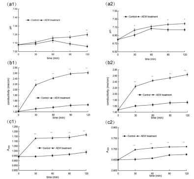 Fig. 8 Effect of AEW on pathogenic fungal extracellular pH, conductivity, and the release of cellular components. (a1), ( b1), and (c1) P. citrinum treated with AEW: (a2), (b2), and( c2) A. sydowii treated with AEW.
