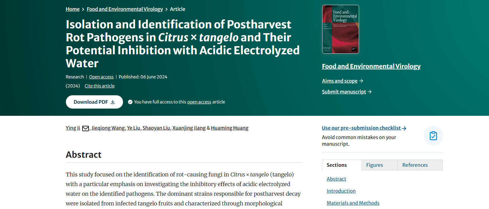 近日,林学系纪颖教授团队在中科院2区农林科学领域学术期刊《Food and Environmental Virology》发表题为 “ Isolation and Identification of Postharvest Rot Pathogens in Citrus × tangelo and their Potential Inhibition with Acidic Electrolyzed Water ” 的研究论文。纪颖教授为第一作者,并为本文通信作者,福建林业职业技术学院为第一完成单位。该研究得到了福建省科学技术厅自然科学基金项目(2022J01388)的资助。