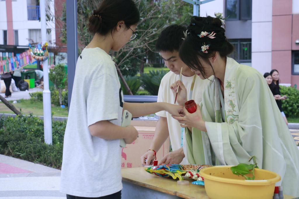 点朱砂:在这个节日里,点朱砂是一项传统的习俗,象征着祈福与平安。这是一种源于中国传统文化的习俗。工作人员用朱砂在参与者手上画一个红点,寓意着祈求平安、驱邪避凶。同学们一起点上朱砂,祈愿平安,事业顺利,健康快乐!
