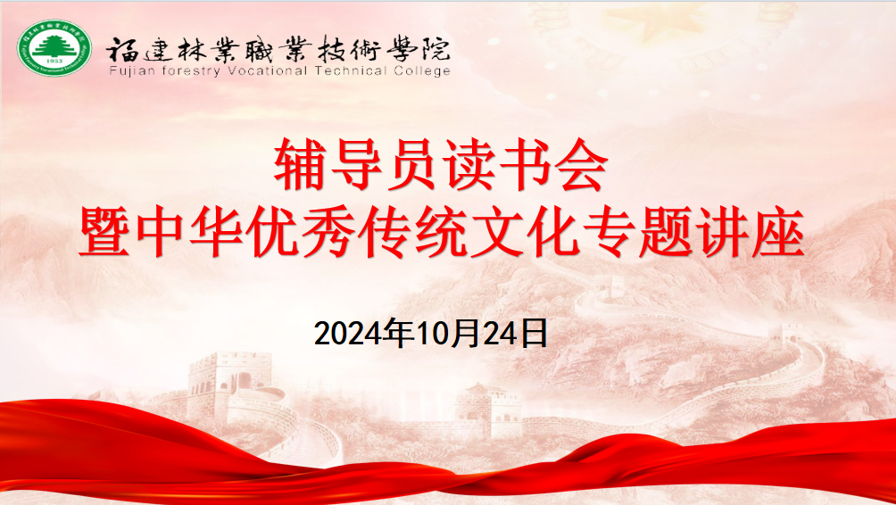 本网讯 为深入学习贯彻党的二十届三中全会精神,深刻理解和把握“两个结合”的重大意义,深入学习贯彻习近平总书记在福建考察时的重要讲话精神,大力弘扬中华优秀传统文化,提升辅导员的综合素养和能力,2024年10月24日上午,林学系承办的辅导员读书会暨中华优秀传统文化专题讲座在江南校区图书馆学术报告厅举行。院学生工作部部长陈友益、院学生工作部副部长陈红英、林学系教学科科长俞群、院团委综合科科长黄晓宁、院宣传部综合科科长彭锦水、院学生工作部学生教育管理科科长温全军、院团委干事王美惠子、张亚畑、各系学生科科长,全体专职辅导员以及林学系师生代表,院社团学生代表等200余人参加本期读书会,讲座由林学系辅导员郑立娜主持。