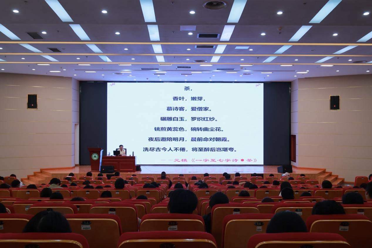 王人恩教授精准把握《红楼梦》和中国茶文化之间的深刻联系,以渊博的学识和深厚的文化底蕴,引领听众步入《红楼梦》如诗如画的世界,细致赏析《红楼梦》中写到的茶事片段,如茶名、茶具、茶礼、茶俗、茶水、茶食、茶诗等,深度解读茶文化对烘托人物性格的作用。为让现场师生能直观地理解《红楼梦》中的茶文化,除配读原文的描写和讲解外,教授还为大家播放了87版电视剧《红楼梦》中与茶相关的经典片段,从《红楼梦》中的茶叙事与茶描写等方面做了直观阐述,让现场师生仿佛置身于曲径通幽的“大观园”之中。