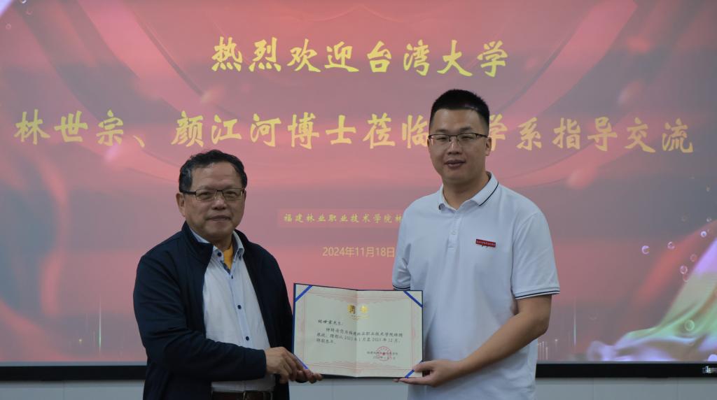 为加强两岸林业教育与科研的互动,共同探索林业绿色发展新路径。2024年11月18日,来自台湾大学的林世宗博士和颜江河博士受邀访问福建林业职业技术学院林学系,与林学系的师生们进行了交流学习。