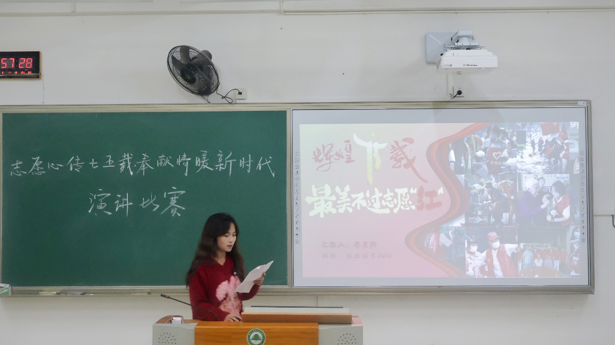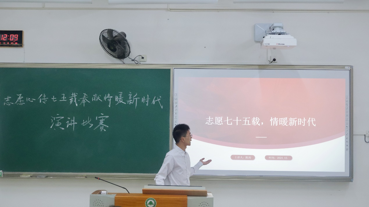 在快节奏的现代生活中,志愿服务作为一种传递爱心、温暖社会的方式,越来越受到人们的重视。为了进一步弘扬志愿服务精神,增强同学们的社会责任感,林学系团总支志愿部于12月8日在教学楼401举办的“志愿心传七五载,奉献情暖新时代” 弘扬志愿者精神演讲比赛圆满落幕。