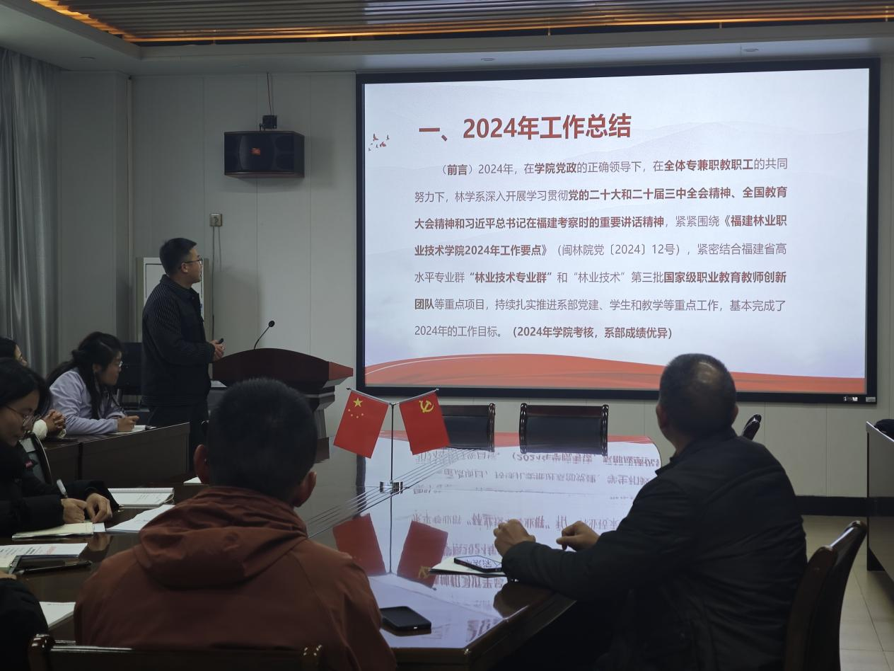 会议伊始,党总支书记傅成杰全面回顾了2024年林学系的工作历程,对全系在教学、科研、学生工作以及党建工作等方面取得的成绩给予了充分肯定,高度赞扬了全体教师的辛勤付出与奉献精神。同时,傅书记也对2025年的工作计划进行了详细阐述,明确了新一年的工作目标与重点任务,激励全体教师在新的一年里再接再厉,勇攀高峰。