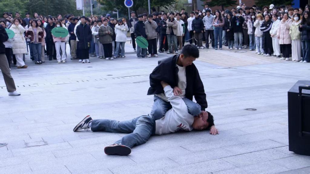 防暴演练环节同样扣人心弦,在图书馆门口模拟场景设定为一名“歹徒”骚扰同学,企图对其造成伤害。工作人员发现情况后,第一时间启动应急响应机制,迅速拿起防暴器械与“歹徒”进行周旋,阻止“歹徒”进一步靠近学生,在工作人员与“歹徒”的激烈对抗下最终成功制服了“歹徒”,解除了危机。