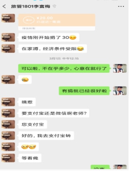 一经讨论就引起党员们热烈反响,支部党员纷纷通过微信和支付宝红包、转账的形式进行捐款,由教师党员做表率,学生党员也是一腔热血,虽然学生资金有限,能力有限,但是他们积极拿出自己的生活费献上自己的一份力量。其中,毕业生党员张文毅虽然毕业一年了,但是收到捐款消息时候第一个进行捐款;有一部分学生党员本身就是贫困生,但是疫情当前他们尽自己力所能及的力量展示党员风采,有李丹萍、李富梅等同学。