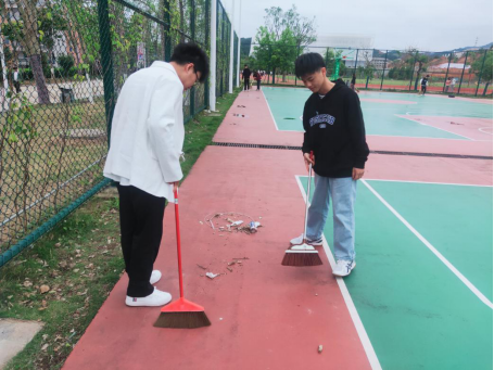 分配好任务便开始行动了,同学们来回穿梭在操场的各个角落,主要清理边边角角堆积的垃圾,对烟头、纸巾、易拉罐等垃圾捡取、分类。把不可回收的垃圾扔入垃圾箱,把部分可回收的(如易拉罐,可乐瓶)进行垃圾分类。