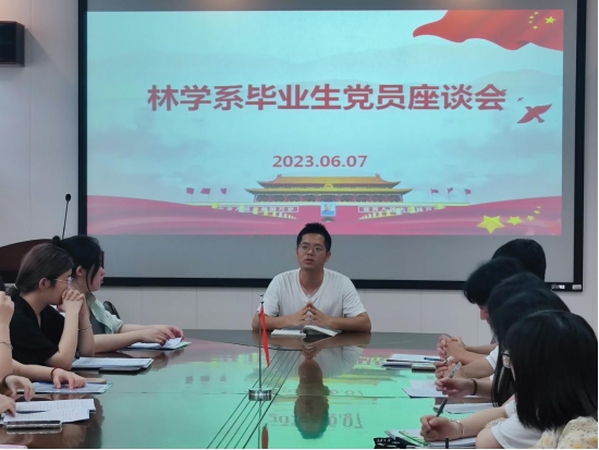 按照学院主题教育工作要求,为了更好解决毕业生党员的最后一公里问题,林学系党总支组织2023届毕业生党员开展集体座谈会,进行党性教育和毕业前交流,出席会议的有党总支书记傅成杰、组织员罗勇、学生第一党支部书记叶知勇、学生第二党支部书记樊寿娜及2023届毕业生党员,会议由党总支书记傅成杰主持。
