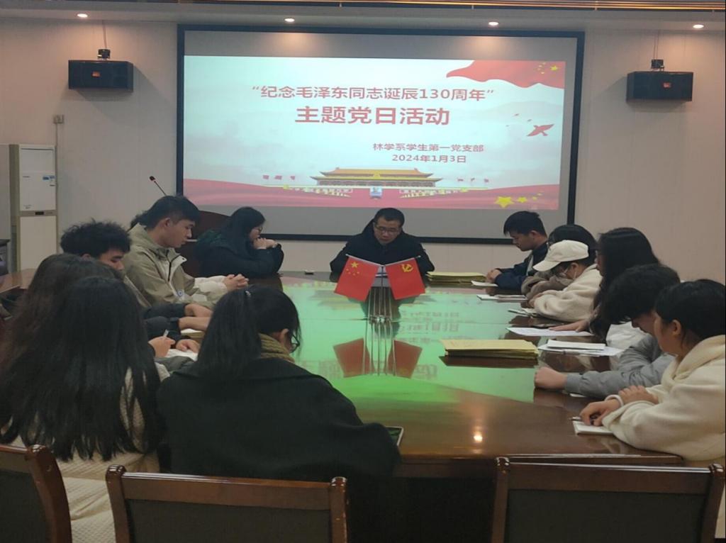 2024年1月3日,林学系学生第一党支部开展“纪念毛泽东诞辰130周年”主题党日活动,本次活动由支部书记叶知勇老师主持,支部全体同学参加。