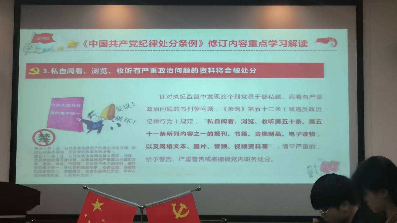 会上,杨靖老师分别从《条例》中的政治纪律、组织纪律、廉洁纪律、群众纪律、工作纪律和生活纪律逐章逐条进行讲解,结合支部党员的实际情况边解读条例,边讲述案例。把典型案例作为“活教材”,以案说德、以案说纪、以案说法、以案说责,进一步教育引导党员们坚定理想信念、筑牢守纪思想防线。同时杨靖老师要求支部全体党员要深化思想认识、提高政治站位,在生活工作中一言一行一举一动都应该以党纪为尺、知戒守纪,切实将党纪党规铭刻在心、力践于行,始终如一做到对党忠诚。