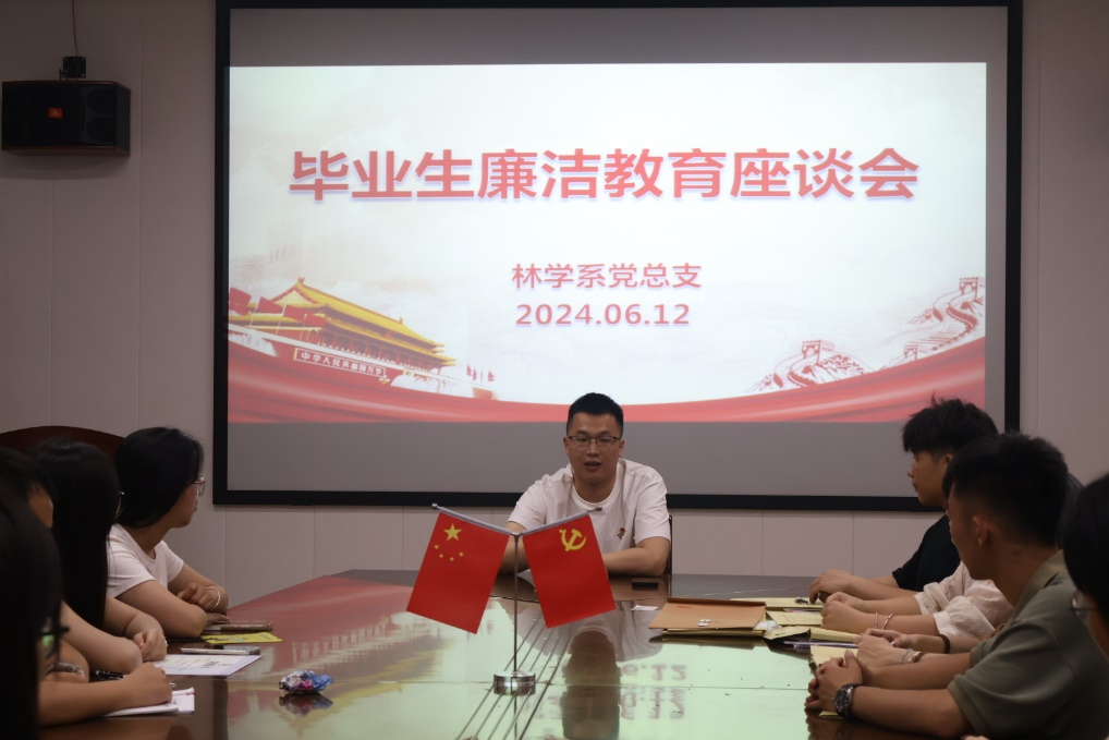 为强化毕业生党员党性修养和廉洁自律意识,引导和激励毕业生党员在新的岗位上争做廉洁自律的表率。林学系党总支于6月12日在林学楼四楼会议室召开“廉洁自律强党性,知行合一担使命” 毕业生党员廉洁教育座谈会。本次会议由党总支书记傅成杰老师主持,2024届全体毕业生党员参会。