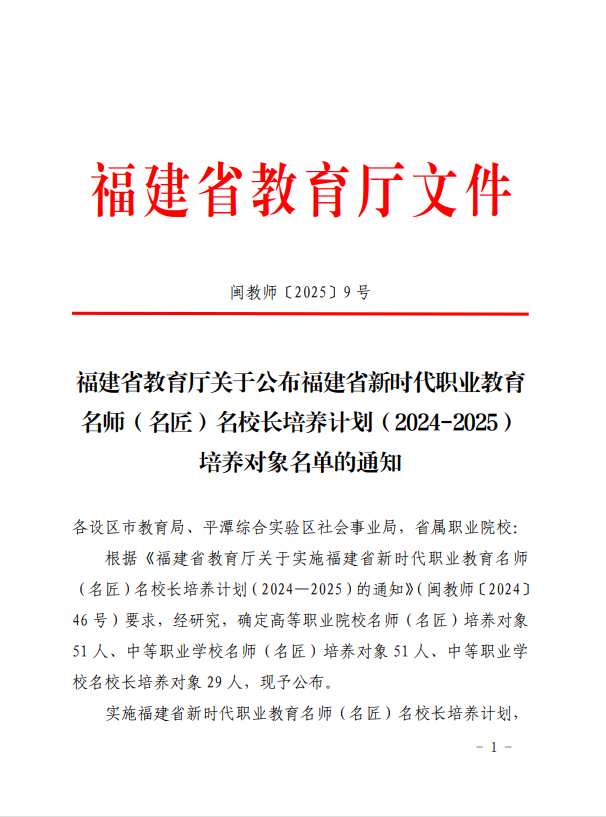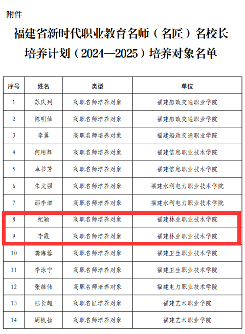 近日,福建省教育厅公布《新时代职业教育名师(名匠)名校长培养计划(2024-2025)培养对象名单》,我校纪颖、李霞两位教师成功入选福建省新时代职业教育高职名师培养对象。