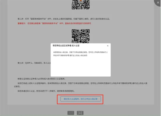 步骤4:未获取出入境记录,页面下方将出现跳过按钮,您可在上传材料页面自行上传在外学习期间的护照/通行证上的出入境记录页。