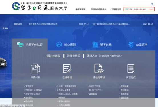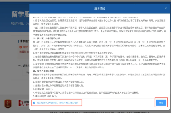 三、办理事项:点击留学e网通服务大厅,认真阅读填报须知后点击“确定”,点击右上角的登录按钮,未注册的用户先选择注册再登录,已有账号的用户通过输入账号密码进行登录。