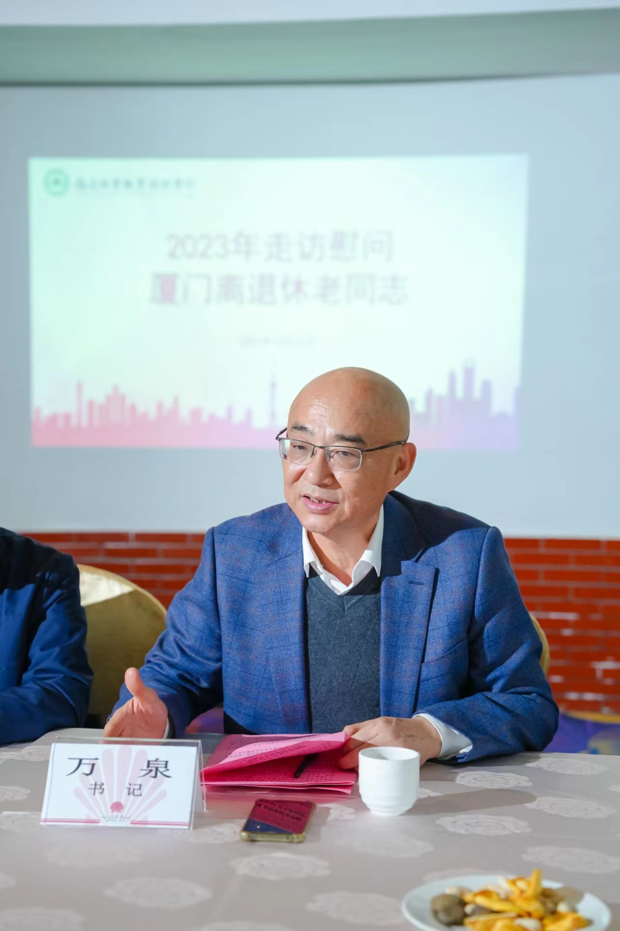 万泉书记向在鹭岛安居的老同志介绍了学院近年来的发展情况。他与退休老同志亲切交谈,详细询问他们的日常饮食起居和身体状况以及当前面临的困难等,向他们送去节日的慰问和祝福。他表示,学院的发展离不开一批又一批老同志打下的坚实基础,学院的光辉历史凝聚着老同志的智慧、心血和汗水。在征求老同志对学院工作的意见和建议时,他表示,希望各位老同志在保重好身体的同时,进一步发挥工作经验丰富、群众基础深厚的优势,继续为学院事业高质量发展的美好明天献计出力。