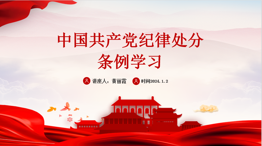 近日,中共中央印发新修订的《中国共产党纪律处分条例》(以下简称《条例》),《条例》全面贯彻习近平新时代中国特色社会主义思想和党的二十大精神,从党章这个总源头出发,坚持严的基调,坚持问题导向和目标导向相结合,与时俱进完善纪律规范,进一步严明政治纪律和政治规矩,带动各项纪律全面从严,释放越往后执纪越严的强烈信号,发挥纪律建设标本兼治作用,为以中国式现代化全面推进强国建设、民族复兴伟业提供坚强纪律保障。《条例》于2024年1月1日起施行。我们支部于1月2日下午14:40,支部全体成员进行了《条例》的学习。