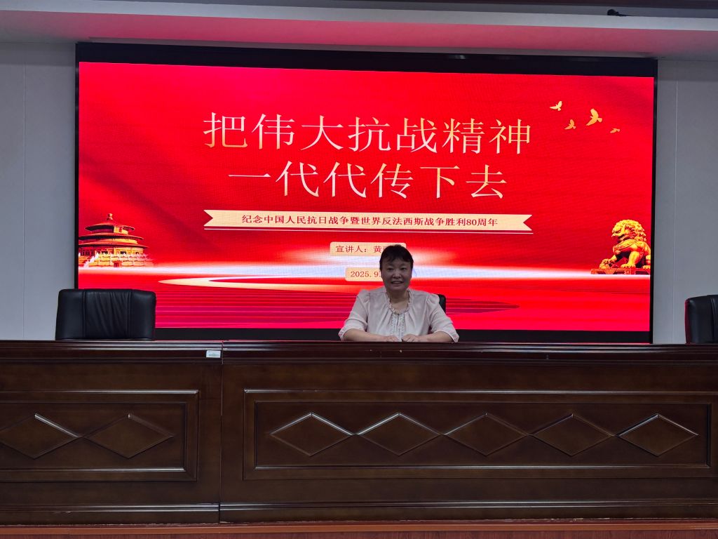 在纪念中国人民抗日战争暨世界反法西斯战争胜利80周年的重要历史时刻,为深切缅怀革命先烈,弘扬伟大抗战精神,汲取奋进力量,9月3日,人事处(教师工作部)和工会联合党支部举行专题党课学习活动。本次党课由党支部书记、人事处(教师工作部)处长黄丽霞同志主讲,主题为《把伟大抗战精神一代代传下去》。