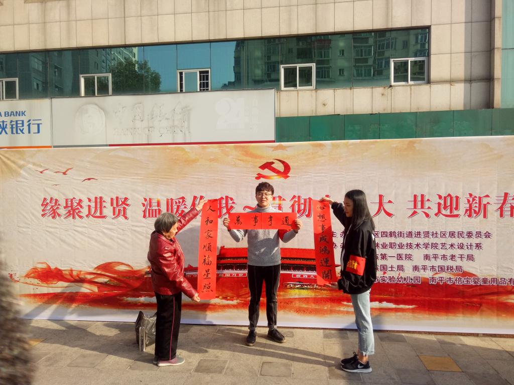 2018年1月19日上午,福建林业职业技术学院艺术设计系联合南平市延平区四鹤街道进贤社区、南平市第一医院、南平市老干局、南平市国土局、南平市税务局、南平市实验幼儿园等单位,合作开展名为“缘聚进贤 温暖你我 贯彻党的十九大 共迎新春年”的党日宣传活动。活动现场,艺术设计系组织开展了“党的十九大精神宣传进社区 中华优秀传统文化进社区 社会温暖关怀进社区”的“三进”工作。