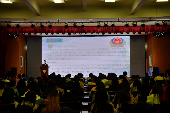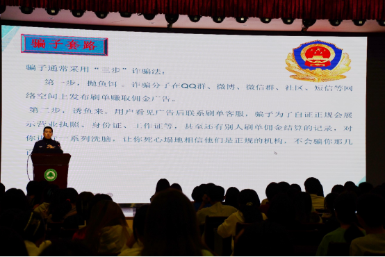 讲座过程中,黄警官以网络贷款类诈骗、信用卡提额诈骗、网络交友诈骗、“淘宝刷单”类诈骗、网络购物退款诈骗、网络交易类诈骗、诱使关机实施诈骗、冒充熟人诈骗、冒充“公检法”诈骗、出售考试作弊工具或答案类诈骗这十种不同的诈骗形式为同学们逐步讲述了网络电信诈骗的严重性。