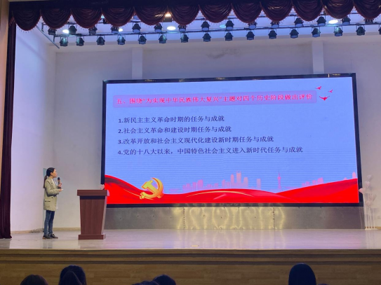 第二阶段,叶章球科长为全体学生干部讲解了全会总结的党的百年奋斗重大成就和历史经验。党的十九届六中全会提出,中国共产党自1921年成立以来,始终把为中国人民谋幸福、为中华民族谋复兴作为自己的初心使命,始终坚持共产主义理想和社会主义信念,团结带领全国各族人民为争取民族独立、人民解放和实现国家富强、人民幸福而不懈奋斗,已经走过一百年光辉历程。党的百年奋斗,书写了中华民族几千年历史上最恢宏的史诗。随后又讲到全会围绕“为实现中华民族伟大复兴”主题对四个历史阶段作出评价,分别是:新民主主义革命时期的任务与成就、社会主义革命和建设时期任务与成就、改革开放和社会主义现代化建设新时期任务与成就和党的十八大以来,中国特色社会主义进入新时代的任务与成就。