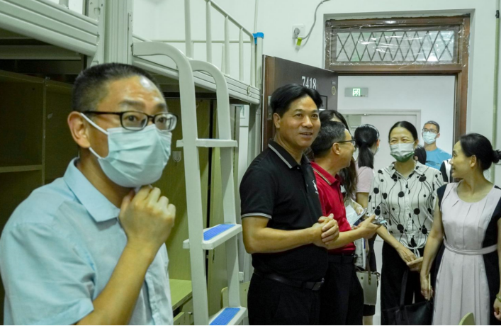 为了解新生入住宿舍情况,为新生送去温暖与关怀,2022年9月12日晚七点,学院党委副书记严绍裕、副院长李肇锋、学工部部长蔡敏、系党总支书记陈政、系主任曾秀云、系党总支副书记叶章球、系副主任张建红、系党总支专职组织员欧阳昭勇、系学生科科长兼团总支书记廖士喜及新生辅导员一行深入走访2022级新生宿舍。走访期间,院系领导及辅导员的关怀与勉励,深深打动了新生,让新生们感受到院系领导和老师对他们殷切的期望和关怀。