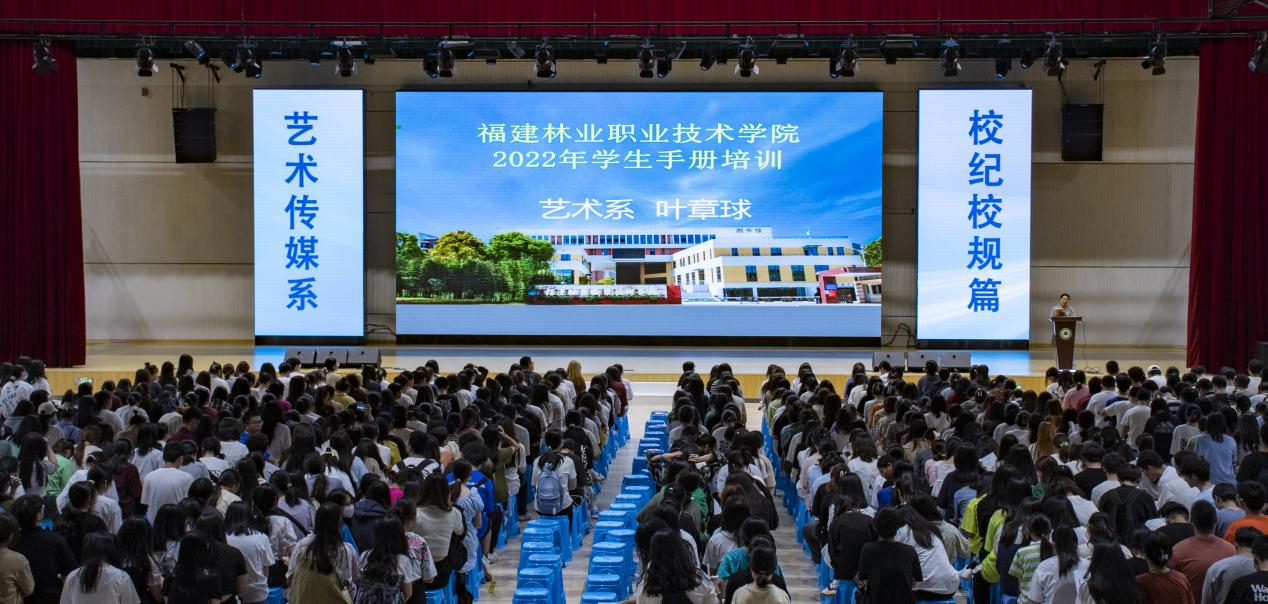2022年9月26日晚,艺术传媒系于江南体育馆举办以校纪校规及学生管理制度教育为主题的2022级新生入学教育讲座。系党总支副书记叶章球老师担任主讲,系学生科科长兼团总支书记廖士喜、新生辅导员及2022级全体新生到场聆听。