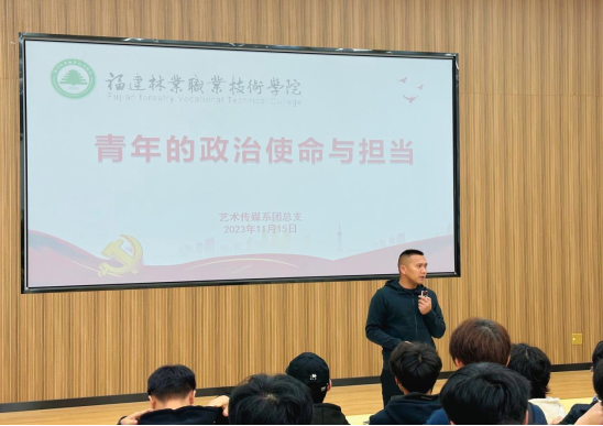 为进一步加强团员的理想信念,提高团员的思想觉悟和综合素养,2023年11月15日晚上19:30,艺术传媒系学生科科长兼团总支书记廖士喜老师在艺术楼阶梯教室为2023级团员开展了主题为青年的政治使命与担当的团课,并且组织学习了《中国共产主义青年团普通高等学校基层组织工作条例》。