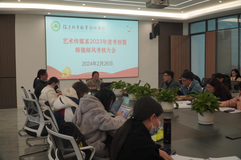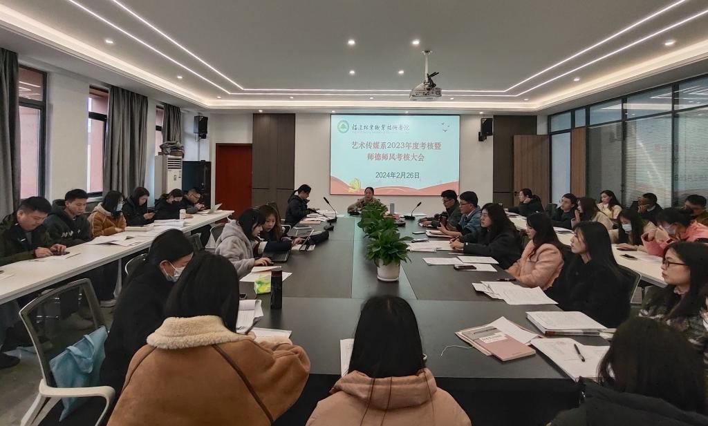 为全面总结过去一年的工作,评价教职工的业绩表现,同时进一步强化师德师风建设,提升教育教学质量,2024年2月26日下午,艺术传媒系于艺术楼401会议室召开2023年度教职工考核暨师德师风考核工作会议。会议由艺术传媒系主任曾秀云主持,全体教职工出席。