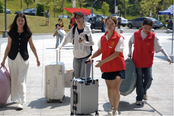 从报到区至宿舍楼,党员先锋岗成员一路引导、肩扛手提,将行李稳稳送至电梯口。“红马甲”在楼道中手势分流、口令引导,“先下后上、快慢分道”维持秩序,减少排队错路。进门后帮助核对床位设施、开启柜门、测试水龙头——确认“人对床、物完好”后,再留下那句暖心的“有事随时找我”,让新生真切感受到家的归属感。
