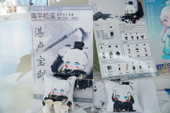 设计说明:该作品以松溪三宝的版画、瓷瓶及湛卢宝剑为灵感。IP形象以“三重非遗融合”为核心,主体选用版画民俗题材中的武将形象,装备搭配湛卢宝剑与瓷版,细节处嵌入冰裂纹、剑首同心圆,全方位绑定三宝元素。设计兼顾刚柔平衡:武将的剑和战衣凸显“刚”,瓷器传递“柔”。既契合传统认知,又打造独特记忆点,强化松溪非遗辨识度。