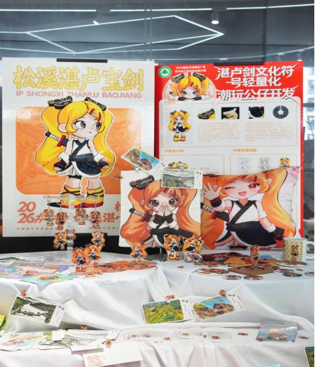 设计说明:该IP形象身背湛卢剑,展现松溪作为“天下第一剑”产地的深厚剑文化底蕴;首饰融入青瓷图纹,体现松溪青瓷的独特艺术魅力;服饰融入松溪版画元素,彰显松溪版画这一民间艺术的特色。
