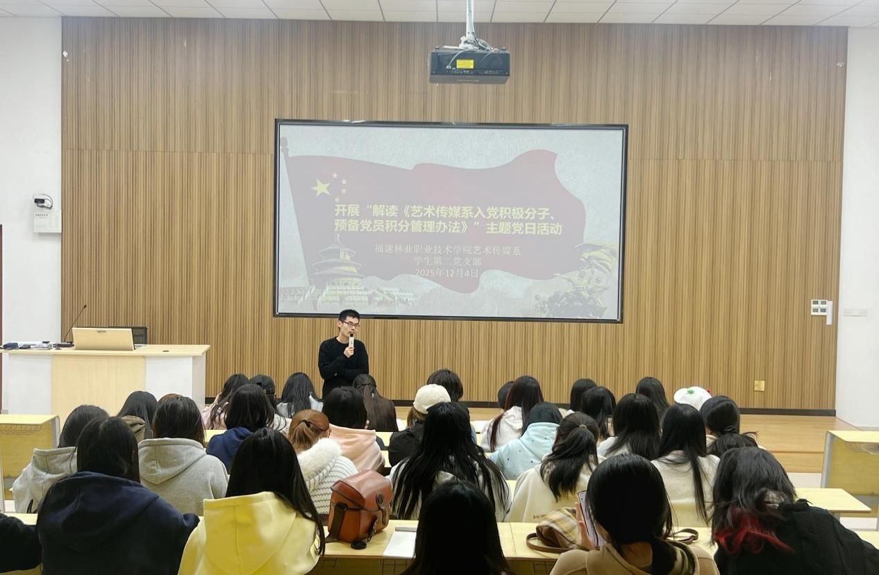 为进一步规范党员发展教育培养工作,保障发展党员工作公开、公平、公正,帮助入党积极分子与预备党员精准把握积分管理要求,充分发挥量化积分的导向与激励作用,2025年12月4日,艺术传媒系学生第二党支部在艺术楼阶梯教室开展“解读《艺术传媒系入党积极分子、预备党员积分管理办法》”主题党日活动。活动由支部书记路雨霏主持,全体党员及入党积极分子参加。