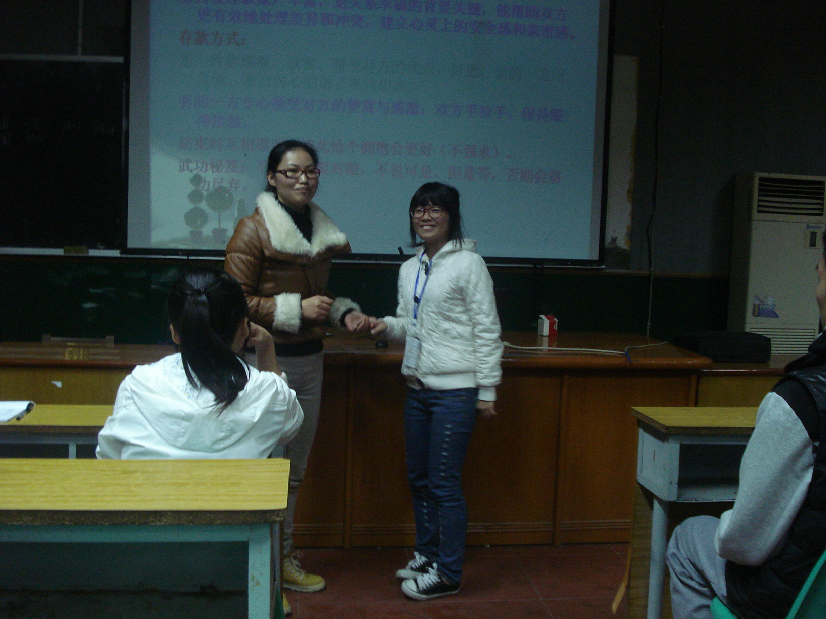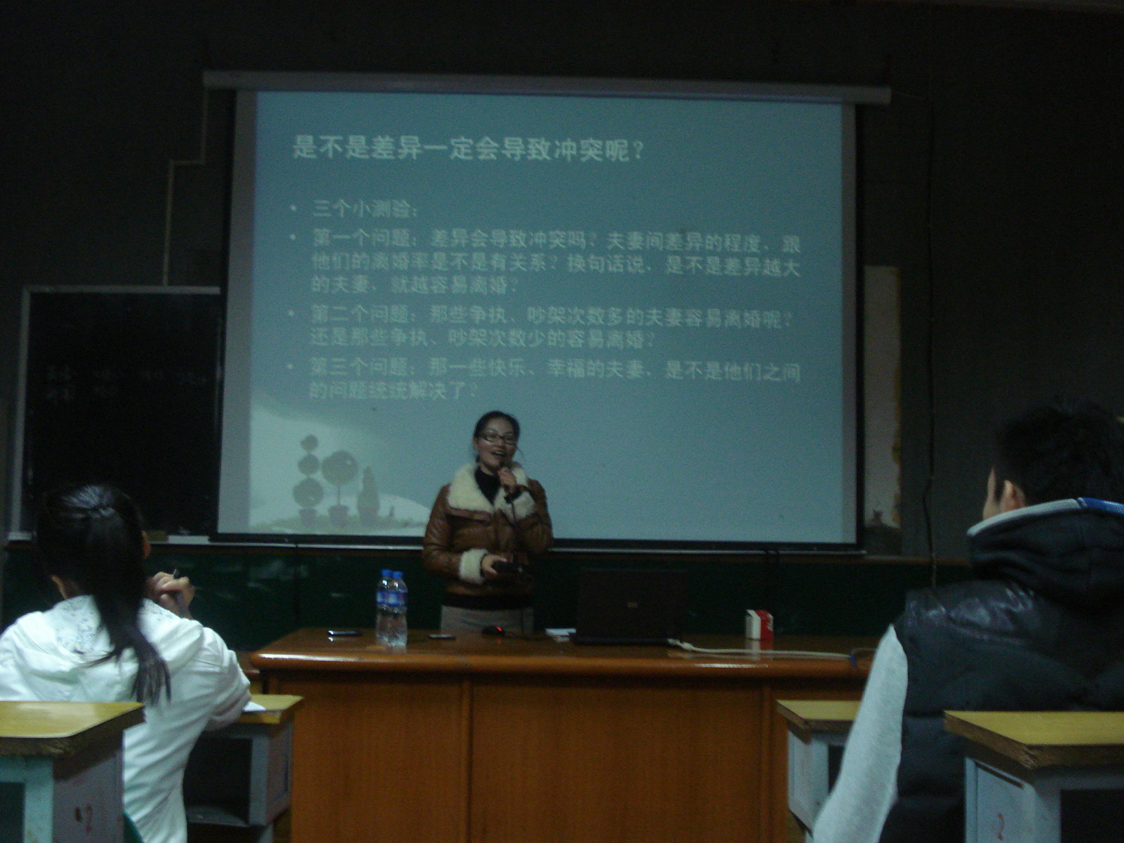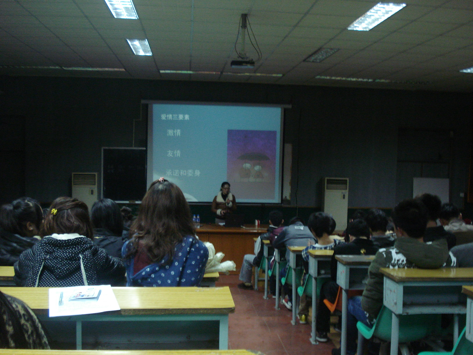 2012年11月28日晚上7:30分,人文社科系辅导员陈红英讲师的主题讲座关于《大学生情绪情感》在第一多媒体举行。本次讲座的参加对象是人文系全体成员及心连心协会的学生,意在让大家不在感情中迷失自我,发展健全的真我,并成为一个能在情感中自由翱翔,沉着应对的新新大学生。