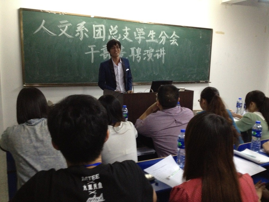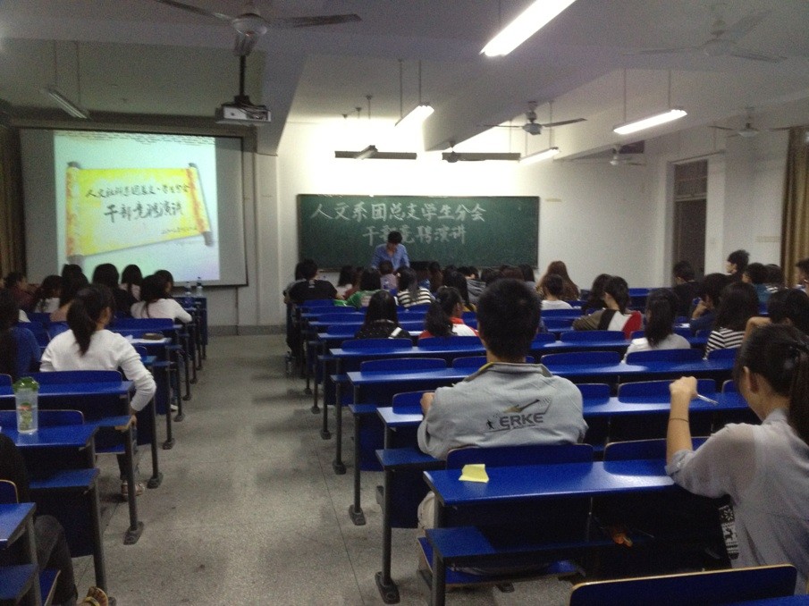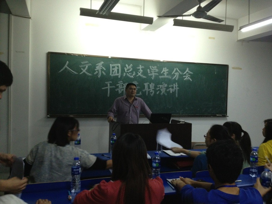 2012年10月23日晚,我院人文社科系在科学楼602开展本学期的团总支学生分会干部竞选演讲大赛。本次的竞选席位包括团总支办公室主任、学生分会主席、各部门部长、副部长,此次竞聘演讲由团总支办公室主任林冬梅和学生分会主席曾一泓担任主持,人文系党总支副书记谢福荣老师、团总支书记陈红英,以及团总支学生分会现任学生干部担任评委。