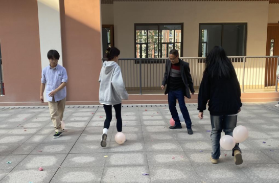 接着是“气球大作战”。比赛分为两个队伍,每个队伍每个人的脚上绑上2个气球,当主持人哨声吹响后,比赛开始,双方在保护己方气球的同时需要踩破敌队的气球。系党总支书记陈政老师也与同学们一同参与游戏中,在你追我踩的场景下,与同学们玩得乐此不疲,体现了亦师亦友、和谐融洽的师生关系。