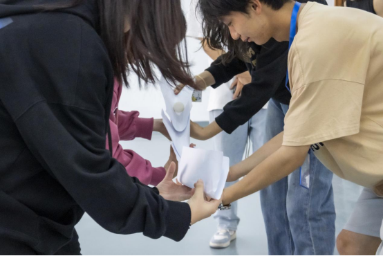 最后是“高山流水”比赛和“摸石头过河”比赛。“高山流水”比赛每队6人,用纸张为小球搭建桥梁,如果球从纸张上掉出,则回到起点重新开始。“摸石头过河”比赛则是脚踩石头,交替行进,接力“过河”,两个比赛都是用时最少的队伍获胜。前者非常考验团队合作的协调性,稍微一点不小心球就会掉落,选手们都屏息敛声,生怕声音会影响手中的球。后者的赛事现场又是另一种场景,选手们步伐矫健、奋力向前,呐喊声、加油声也响彻全场,为校园增添了激情与活力。