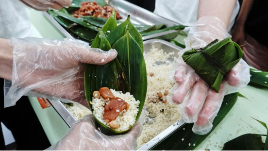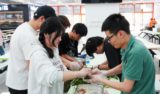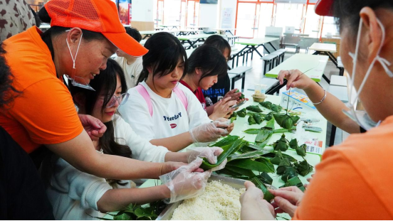 同学们个个劲头十足,在食堂阿姨的指导下,挑粽叶、折粽叶、填糯米、放料陷、裹叶子、扎粽绳,动作逐渐娴熟,一张张粽叶在大家的手中翩翩起舞,一双双巧手不停忙碌。转瞬间,大家包出了一捆又一捆的粽子,一个个形态美观的粽子呈现眼前。现场欢声笑语、气氛热烈。大家一起边包粽子,一边谈论端午节的起源、传说,处处弥漫着粽叶的清香,洋溢着端午节的欢乐氛围。