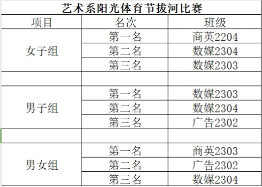为进一步丰富校园体育文化活动,培养同学们的集体荣誉感和积极向上拼搏精神。我院于2023年11月5日—2023年12月15日开展第十四届“迎新杯”体育节活动。艺术传媒系学子们积极参与,此次的活动项目包含拔河比赛、乒乓球比赛以及羽毛球比赛。