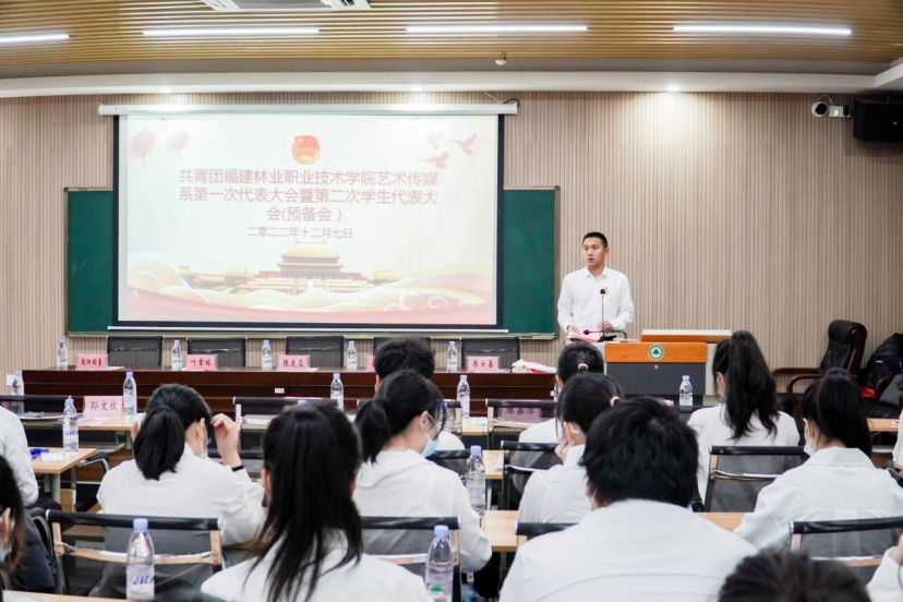 2022年12月7日上午,福建林业职业技术学院艺术传媒系第一次团员代表大会暨第二次学生代表大会在天麟校区科教楼101会议室隆重召开。院团委书记陈友益,艺术传媒系党总支书记陈政,党总支副书记叶章球,专职组织员欧阳昭勇,学生科科长兼团总支书记廖士喜、系专职辅导员孙文欣、唐婧、雷忠春、宋慧敏、陈鑫洁、陈欣、王玮琪,2021届主席团成员黄嘉琪、李玲同学,以及我系48名团员代表和学生代表参加了本次大会。本次大会共分为五个阶段。