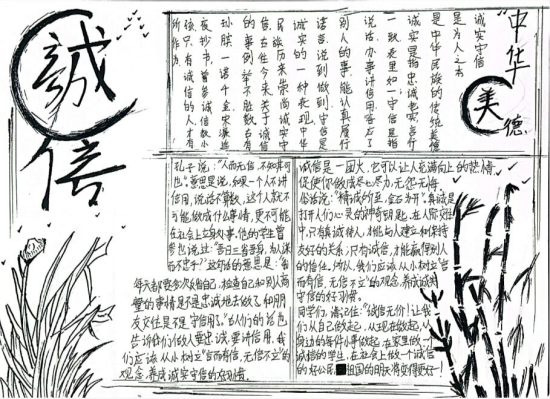 诚信教育我们有“画”说,一幅幅手抄报,一个个生动的事例,鲜艳的色彩,工整的文字,都向我们揭示着诚信的重要性。
