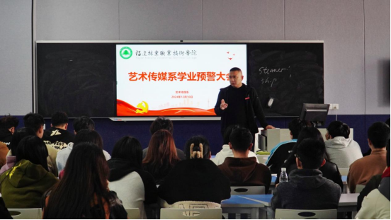 为加强学风建设,提高学生的学习积极性和自我管理能力,树立积极向上的系部风貌,2024年12月10日中午,艺术传媒系于艺术楼202教室召开2024-2025学年第一学期学业预警大会,本次大会由艺术传媒系学生科科长兼团总支书记廖士喜主讲,相关学生参会。