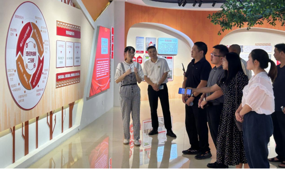 信息系工程系华建祥主任、党总支副书记(主持)叶文美、专职组织员谢婉欣老师向黄彪校长一行介绍全国标杆党建馆建设成果。