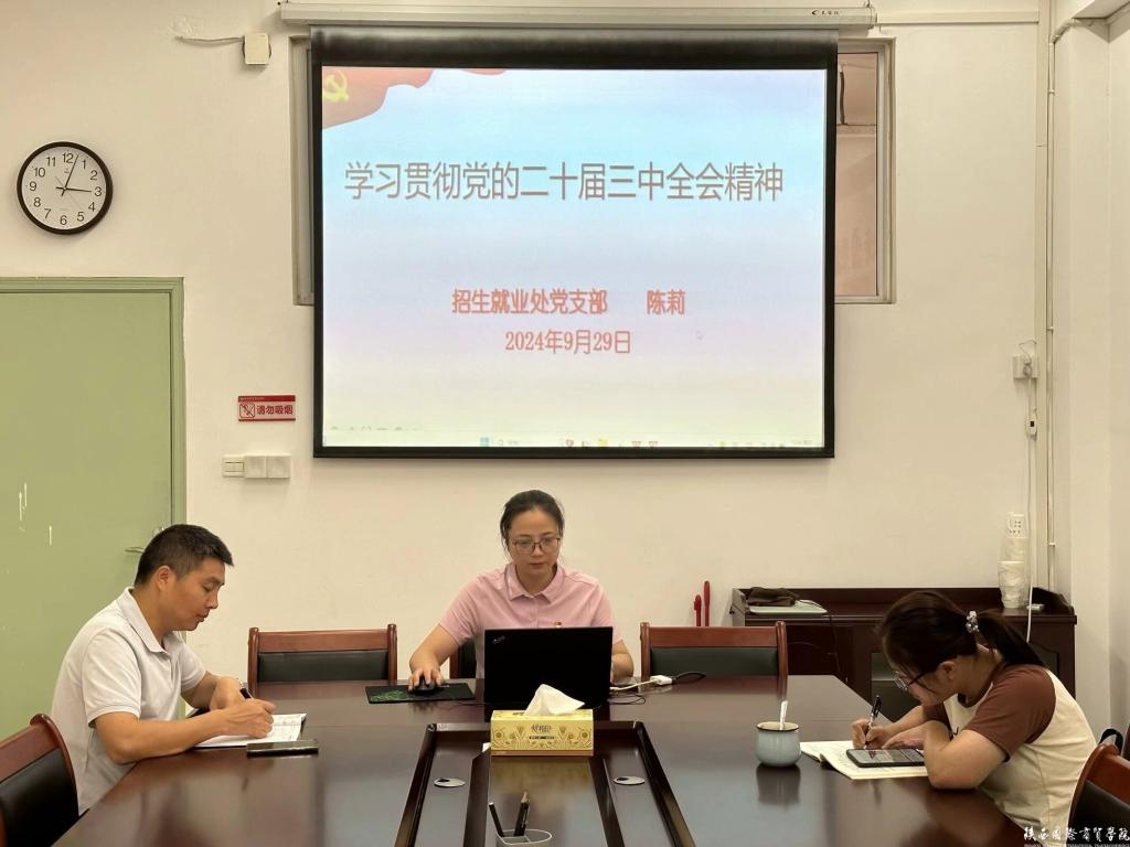 9月29日下午,招生就业处党支部在行政办公楼四楼会议室开展党的二十届三中全会精神专题学习,陈莉书记围绕“七个聚焦”和“进一步全面深化改革的总目标”作党的二十届三中全会精神宣讲。同时强调,支部党员要把学习好贯彻好党的二十届三中全会精神作为当前和今后一个时期的一项重大政治任务,学习贯彻好党的二十届三中全会精神,深入学习领会习近平总书记关于全面深化改革的一系列新思想、新观点、新论断,深刻理解和把握进一步全面深化改革的重大意义、丰富内涵和实践要求,把改革的精神、改革的思维、改革的方法贯穿系部各项工作全过程。