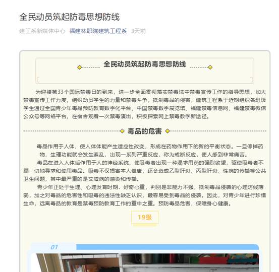 为深化青少年毒品预防教育“6·27”工程和禁毒“十百千万”工程建设,进一步增强在校大学生识毒防毒拒毒意识和能力,持续巩固学校毒品预防教育工作成效,根据省禁毒办《关于开展“全民禁毒宣传月”活动的通知》部署要求,我院印发了《福建林业职业技术学院关于开展“禁毒宣传月”活动的通知》,就在全院范围内开展“禁毒宣传月”相关工作做了全面部署。