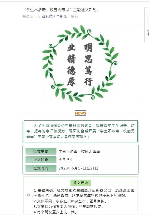 为深入贯彻落实习近平总书记关于“坚持关口前移,预防为先,重点针对青少年等群体,深入开展毒品预防宣传教育”的重要指示精神,根据《关于加强新时代全民禁毒宣传教育工作的实施意见》(闽禁毒委〔2019〕14 号)、《2020 年全省禁毒工作要点》(闽禁毒办〔2020〕10 号)的文件精神和省禁毒办《关于开展“全民禁毒宣传月”活动的通知》的有关部署,为切实推动毒品预防宣传教育工作,福建林业职业技术学院于近期在全院范围内开展“禁毒宣传月”活动,现将活动总结如下: