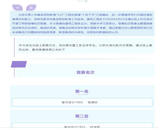 6月26日,交通工程系开展了线上禁毒知识竞赛活动,以竞赛的方式带动学生学习禁毒知识。各班学生积极响应,通过活动的开展,让学生们对禁毒知识又有了新的感悟,不仅提高了同学们的禁毒意识,更是创建了一个和谐的“无毒”校园。