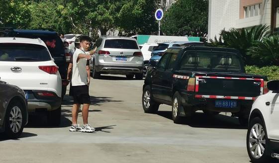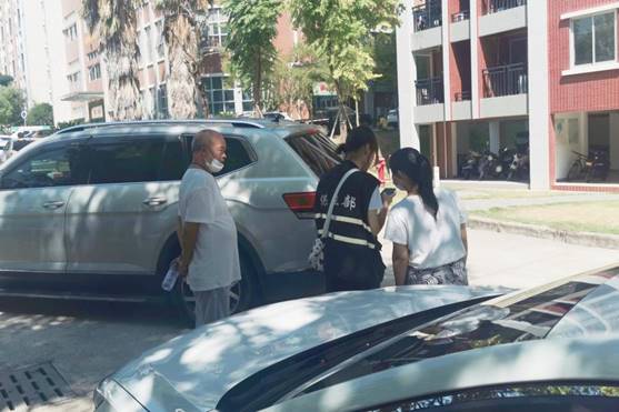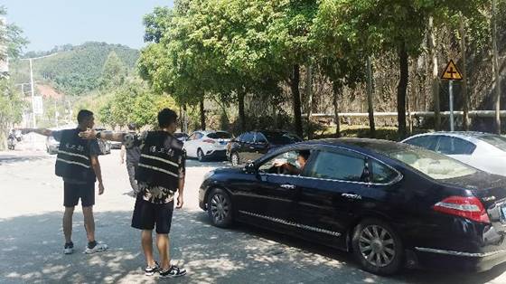 新生报到期间,安保处工作人员7点前集结队伍完毕,奔赴各工作岗位。由于今年新生数量较往年有大幅增加,车流量急剧增加,安保处对校内车辆采取单向管理,引导家长车辆在道路单侧有序停放。工作人员和志愿者顶着烈日指挥交通,耐心向过往车辆做解释引导工作,遇到学生搬行李马上主动上前帮忙,遇到家长问路细心给予解答。工作人员和志愿者都被晒得满脸通红,嗓子嘶哑,仍然热心奔赴在第一线。